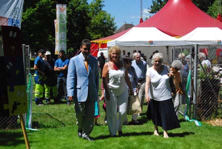 M. Jean-Locher, Conseiller administratif en charge des Bâtiments et Infrastructures, entrant dans le parc réaménagé au chemin de la Gradelle, accompagné de membres du Club des aînés Les Chênes.