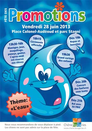 19h30 : Grand cortège des enfants Thème : L'Eau avec les autorités communales, les élèves et enseignants des écoles enfantines et primaires, accompagnés par l'Echo du Chêne (fanfare de Pampigny) et La Lyre de Chêne-Bougeries Dès 21h00 : Bal avec DJ Friz 13h00-22h00 : Expositions "L'Eau, une ressource vitale" et des dessins des élèves à l'Espace Nouveau Vallon