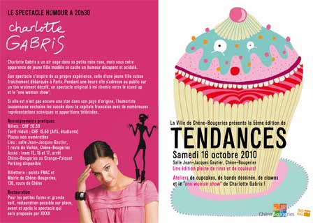 100 billets pour le spectacle de Charlotte Gabris sont en vente à la mairie au prix de CHF 17.- au lieu de CHF 20.50 et CHF 12.- au lieu de CHF 15.50 pour les personnes en âge AVS ou les étudiants.