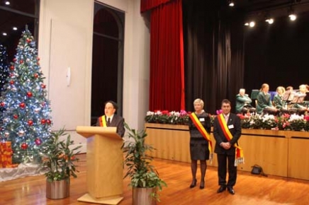 Entouré de ses collègues du Conseil administratif, Mme Béatrice Grandjean-Kyburz, M. Jean Locher, et en présence de nombreux conseillers municipaux, M. Jean-Michel Karr, Maire, a prononcé un discours sur le thème de l’espoir, reprenant une citation de Victor Hugo figurant au dos de la carte de voeux 2015: "L'espoir est aussi important dans la vie d'un être humain que les ailes pour un oiseau."