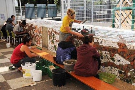 Le projet de cette mosaïque participative s’est bien sûr inscrit dans ce processus et de par sa valeur artistique et esthétique vient ici embellir un simple mur de béton. Les sept jeunes, âgés de 15 à 20 ans, ont été initiés au travail avec de la céramique recyclée ou artisanale, au façonnage d’argile et à la technique des glaçures. Des petits jouets des élèves de l’école primaire, qui ont ainsi été associés au projet, ont pu être intégrés dans les mosaïques.