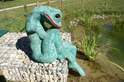 La bouche fermée, une patte recroquevillée, qui laisse à peine entrevoir ses seins, des bras atrophiés et un pied palmé cherchant la fraîcheur de l'eau, moitié grenouille, moitié femme, la nouvelle sculpture de Zaric vient de prendre place sur le bord de l'étang du parc Stagni.