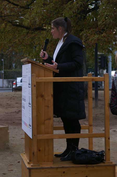 Inauguration de l'installation urbaine "Ode est où?" située au centre de la fontaine place C. Audéoud, en présence de la lauréate du concours Caroline Tapernoux et des autorités communales. Tableau d'eau et de lumières qui changent en fonction de la température.