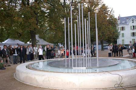 Inauguration de l'installation urbaine "Ode est où?" située au centre de la fontaine place C. Audéoud, en présence de la lauréate du concours Caroline Tapernoux et des autorités communales. Tableau d'eau et de lumières qui changent en fonction de la température.