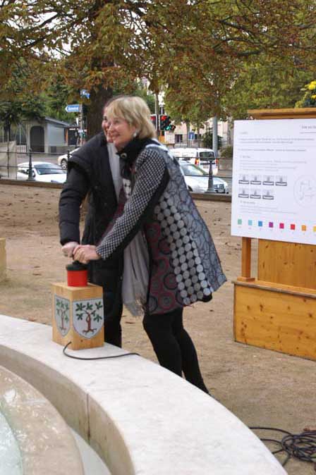 Inauguration de l'installation urbaine "Ode est où?" située au centre de la fontaine place C. Audéoud, en présence de la lauréate du concours Caroline Tapernoux et des autorités communales. Tableau d'eau et de lumières qui changent en fonction de la température.